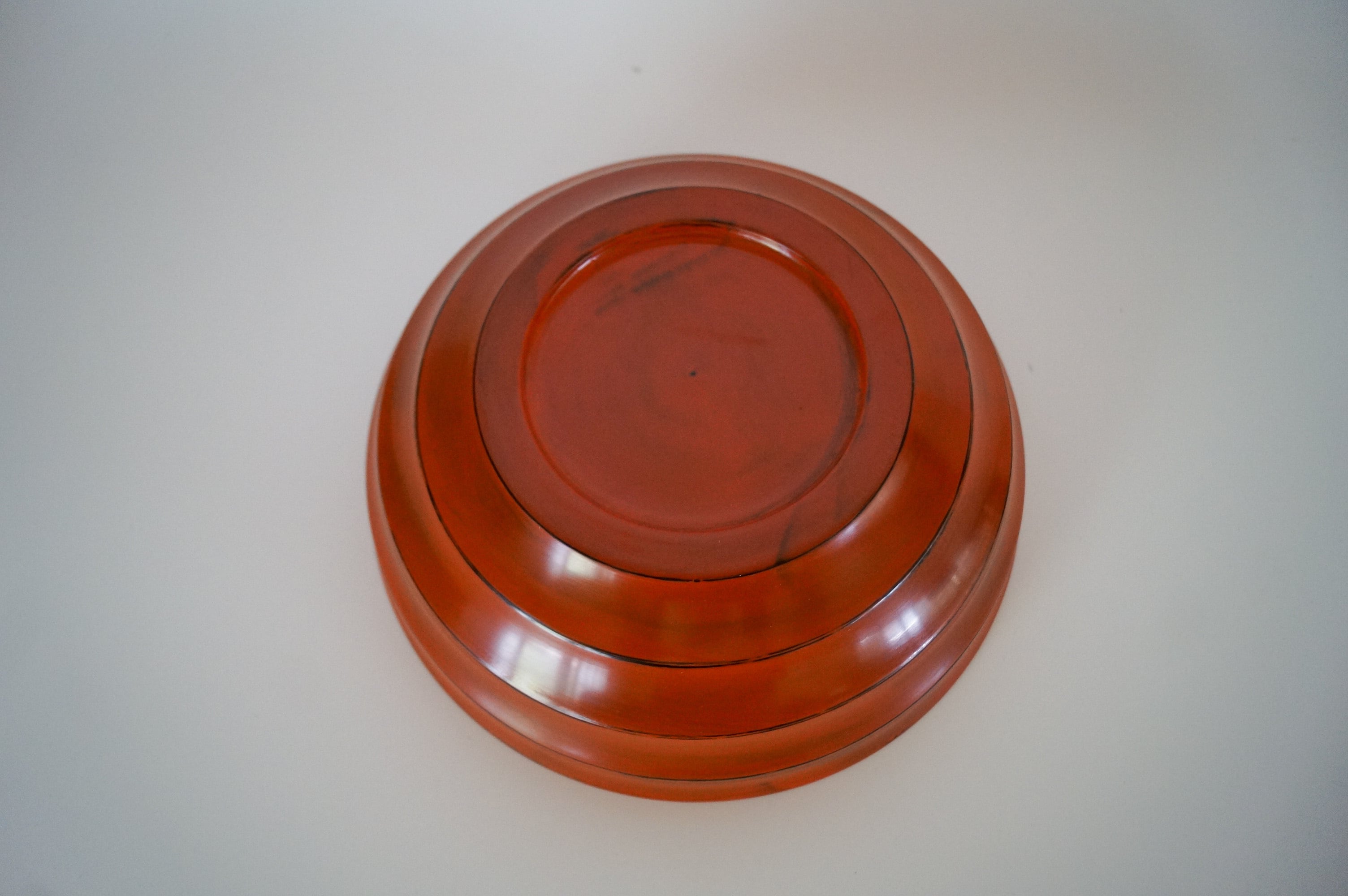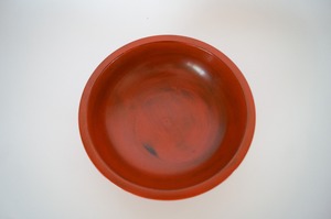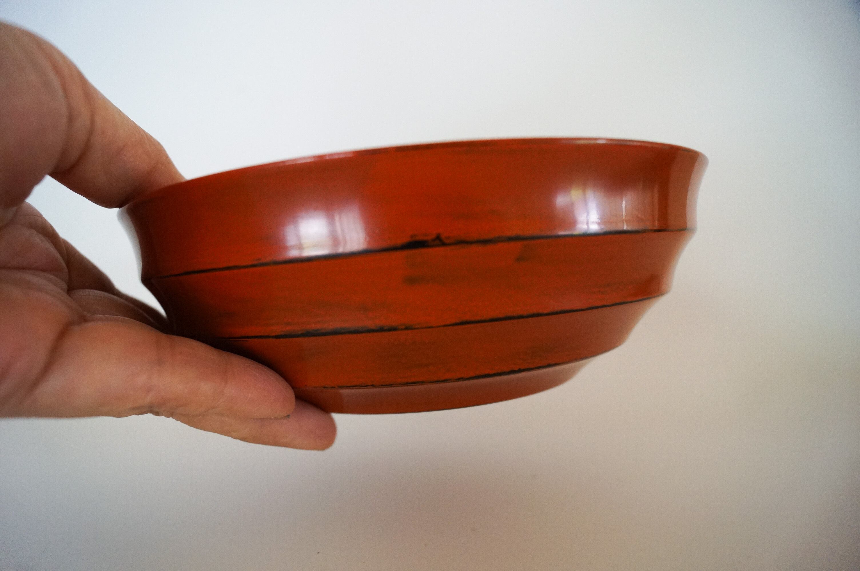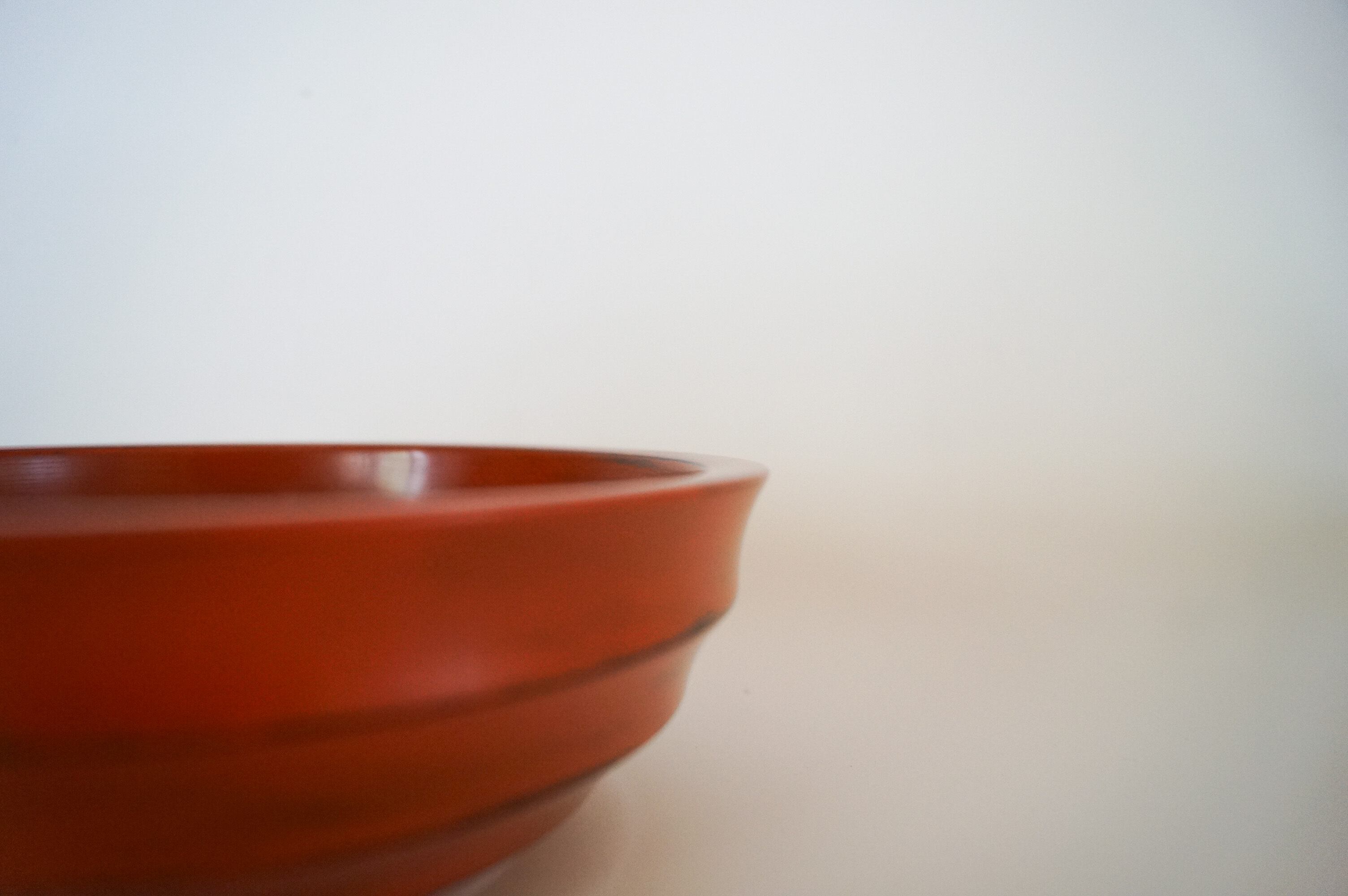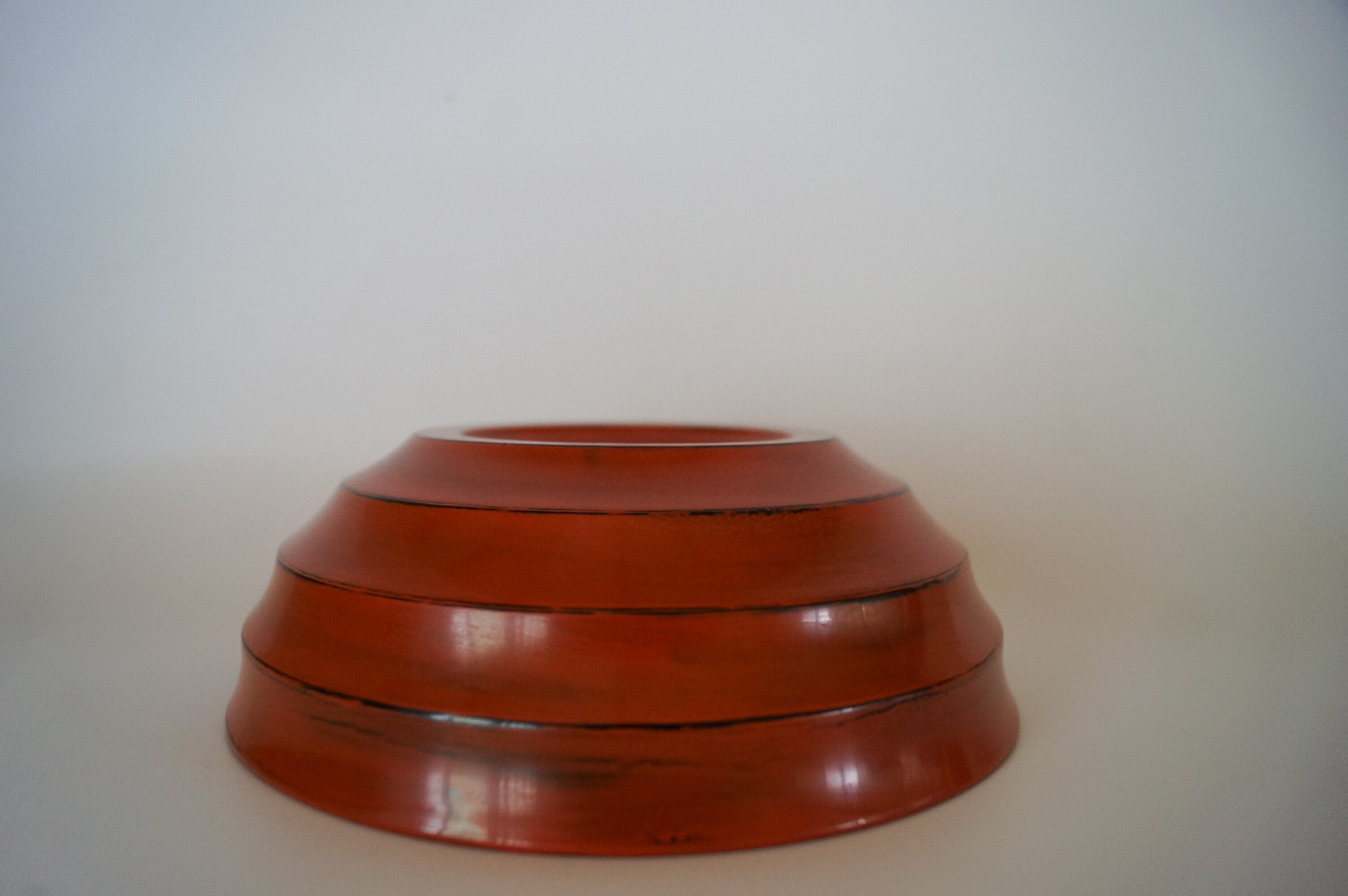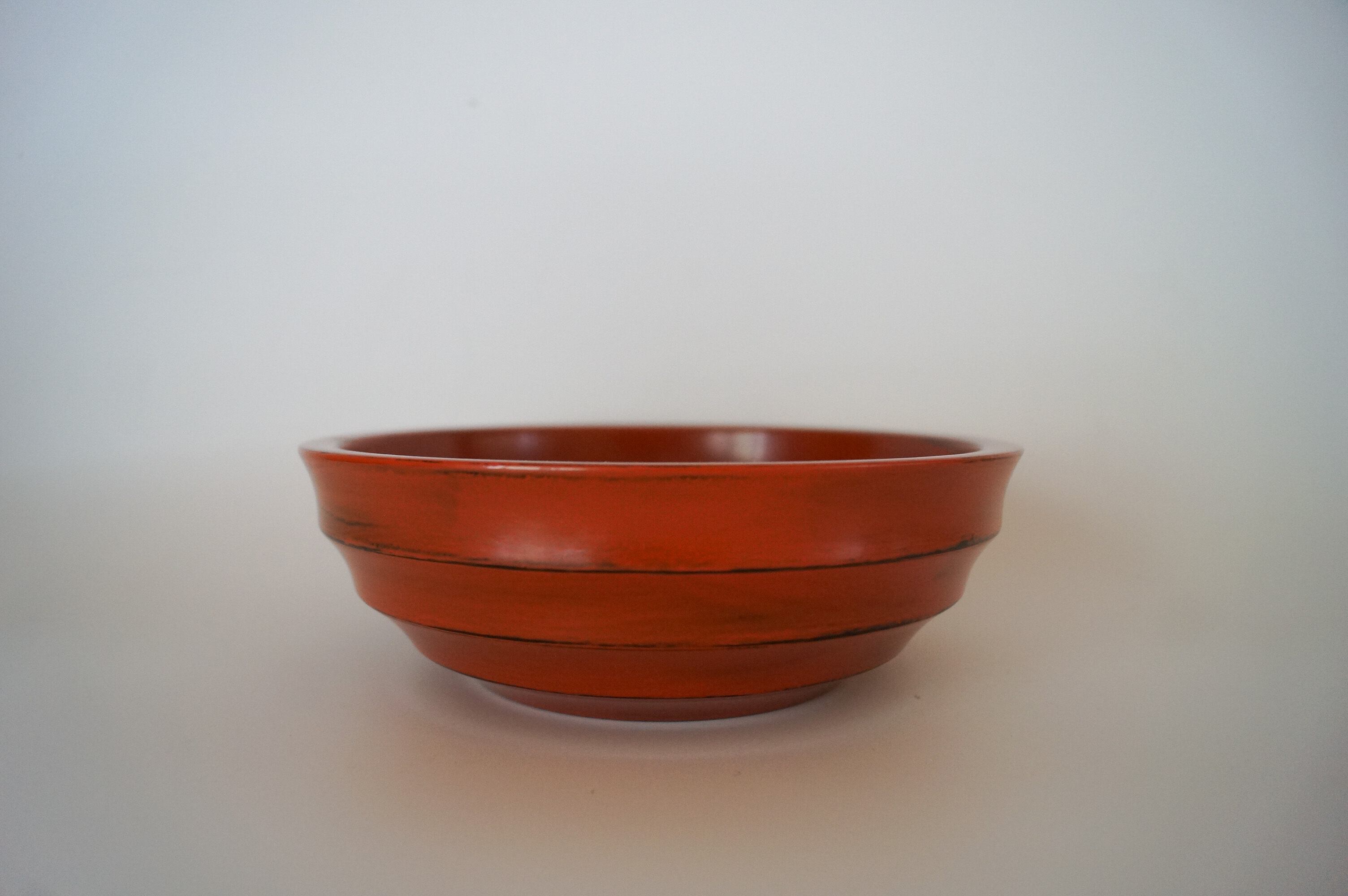 漆の赤(黄口)を塗り重ね、根来風に中塗りの黒を研ぎだしたデザインです。