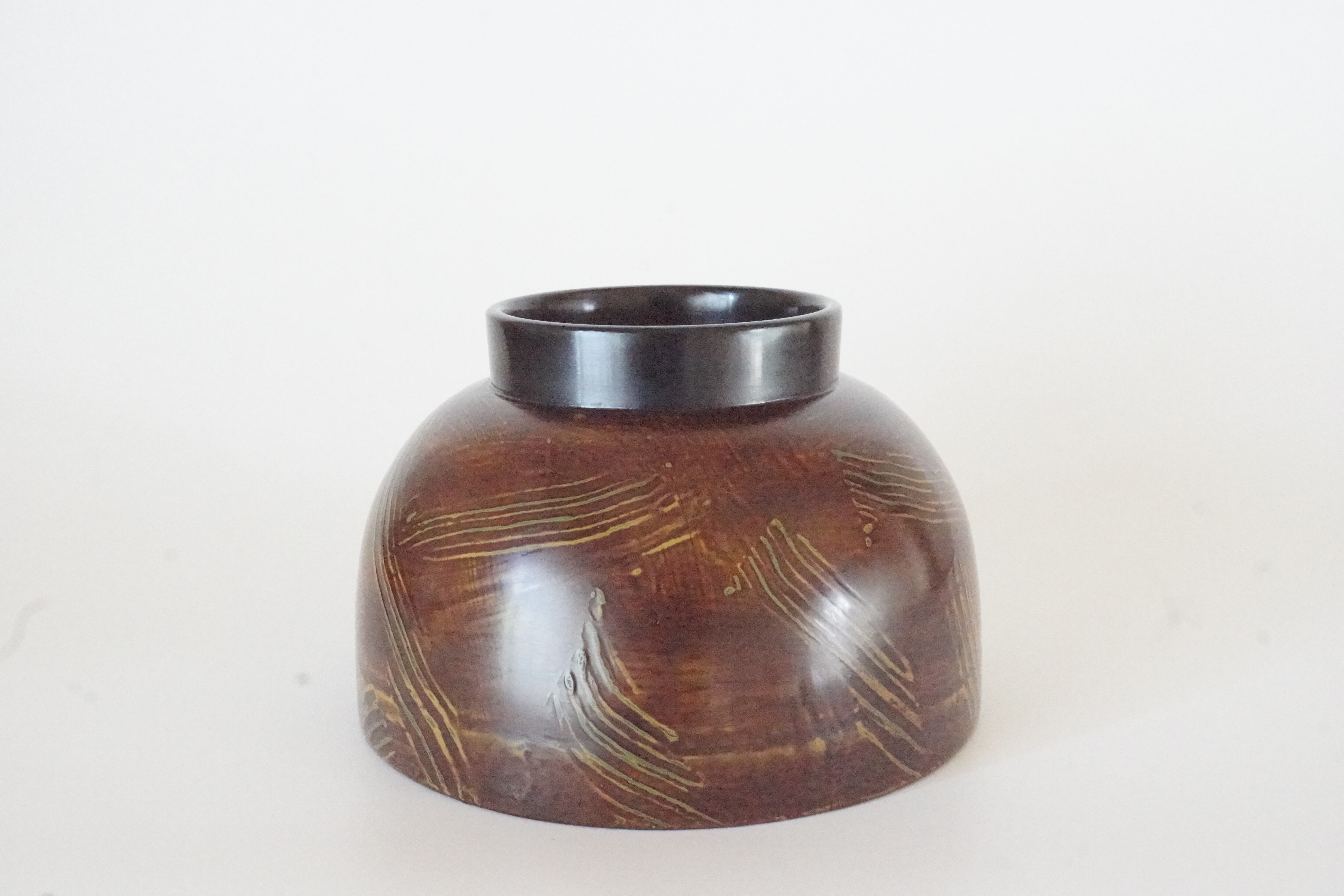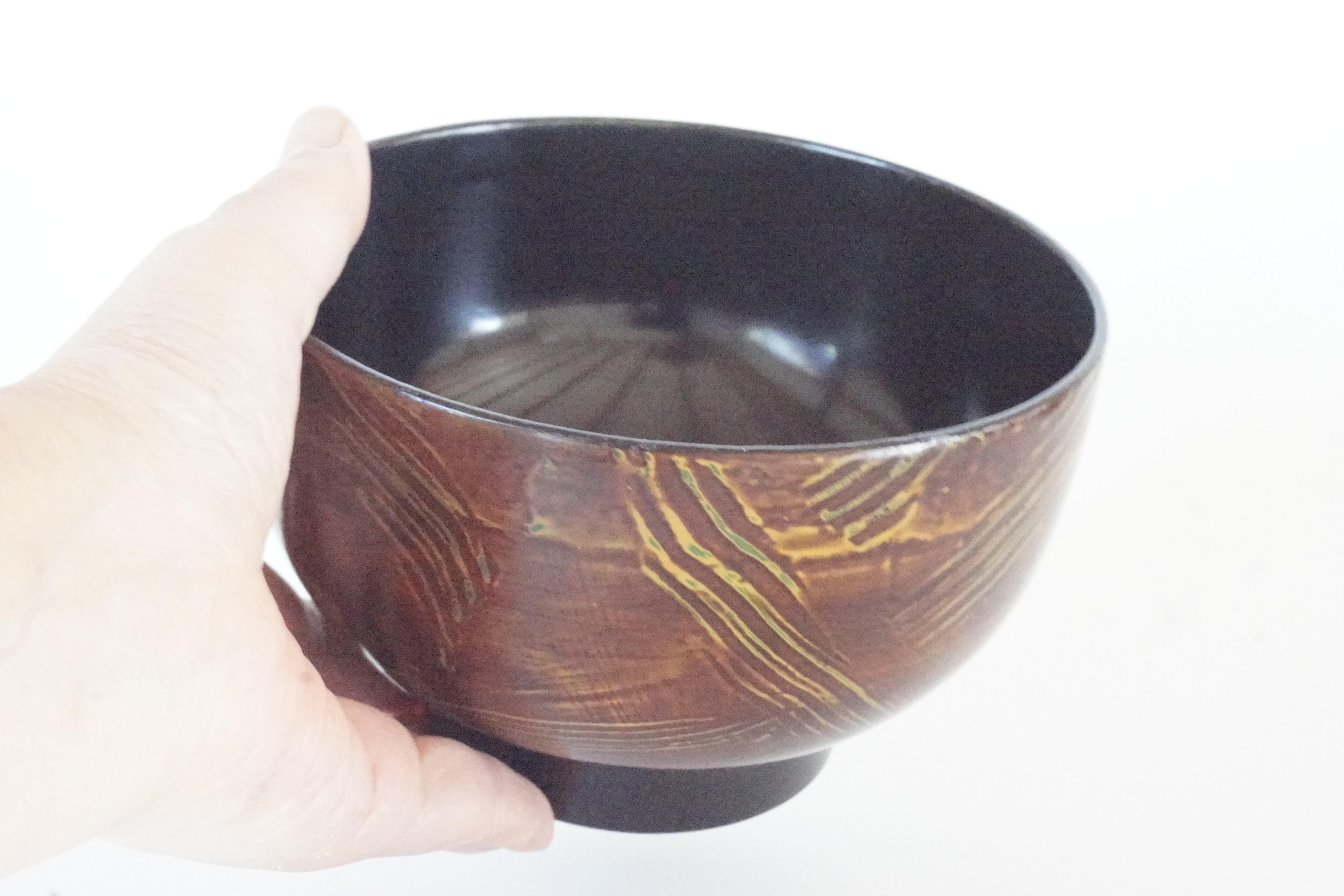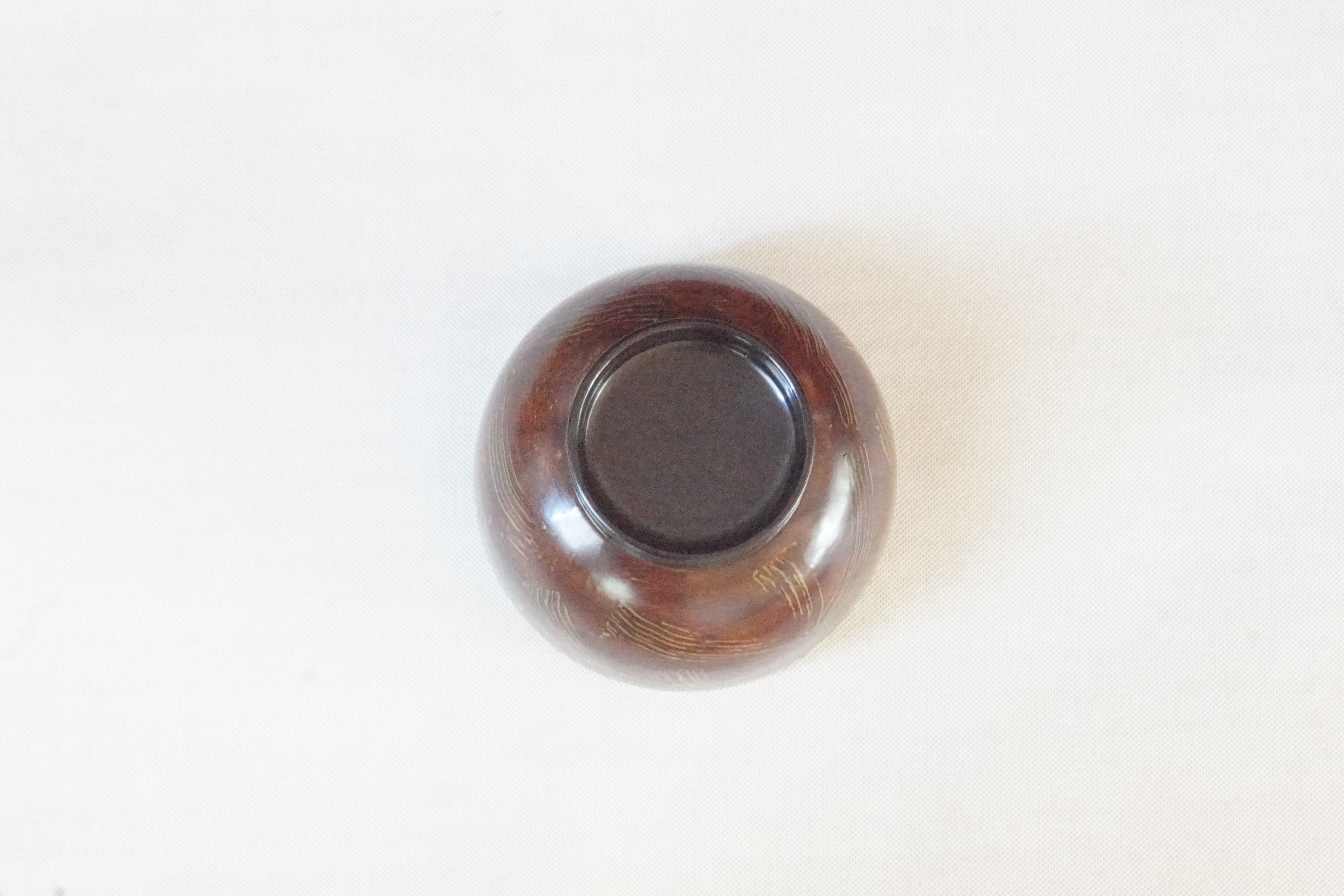 絞塗りというちょっと変わった技法です。下に黄色の漆を塗り上から朱合漆を塗ってヘラで引っ掻いたような傷の模様をつけていて落ち着いた色合いです。縁は布着せをしているので丈夫です。