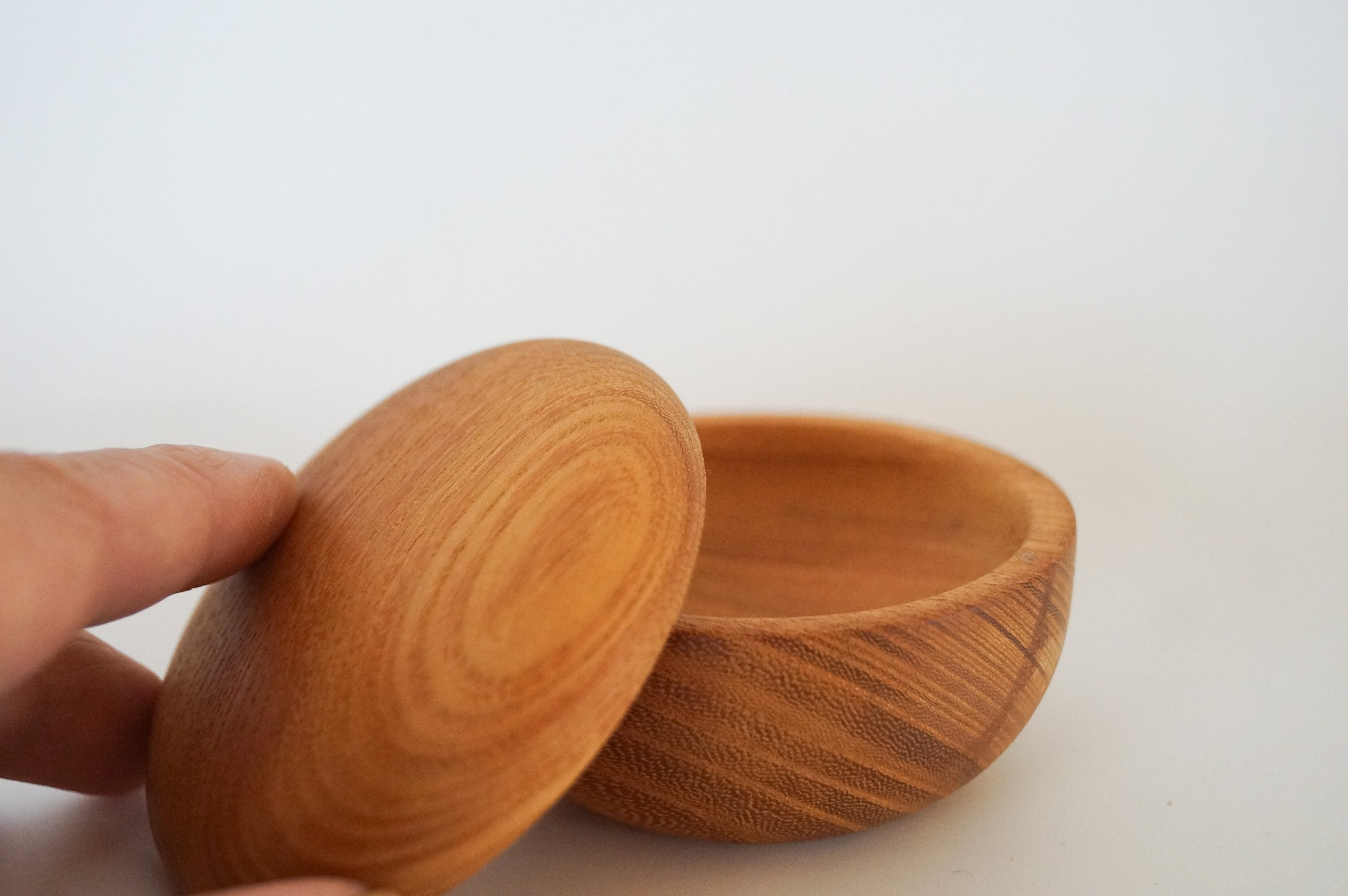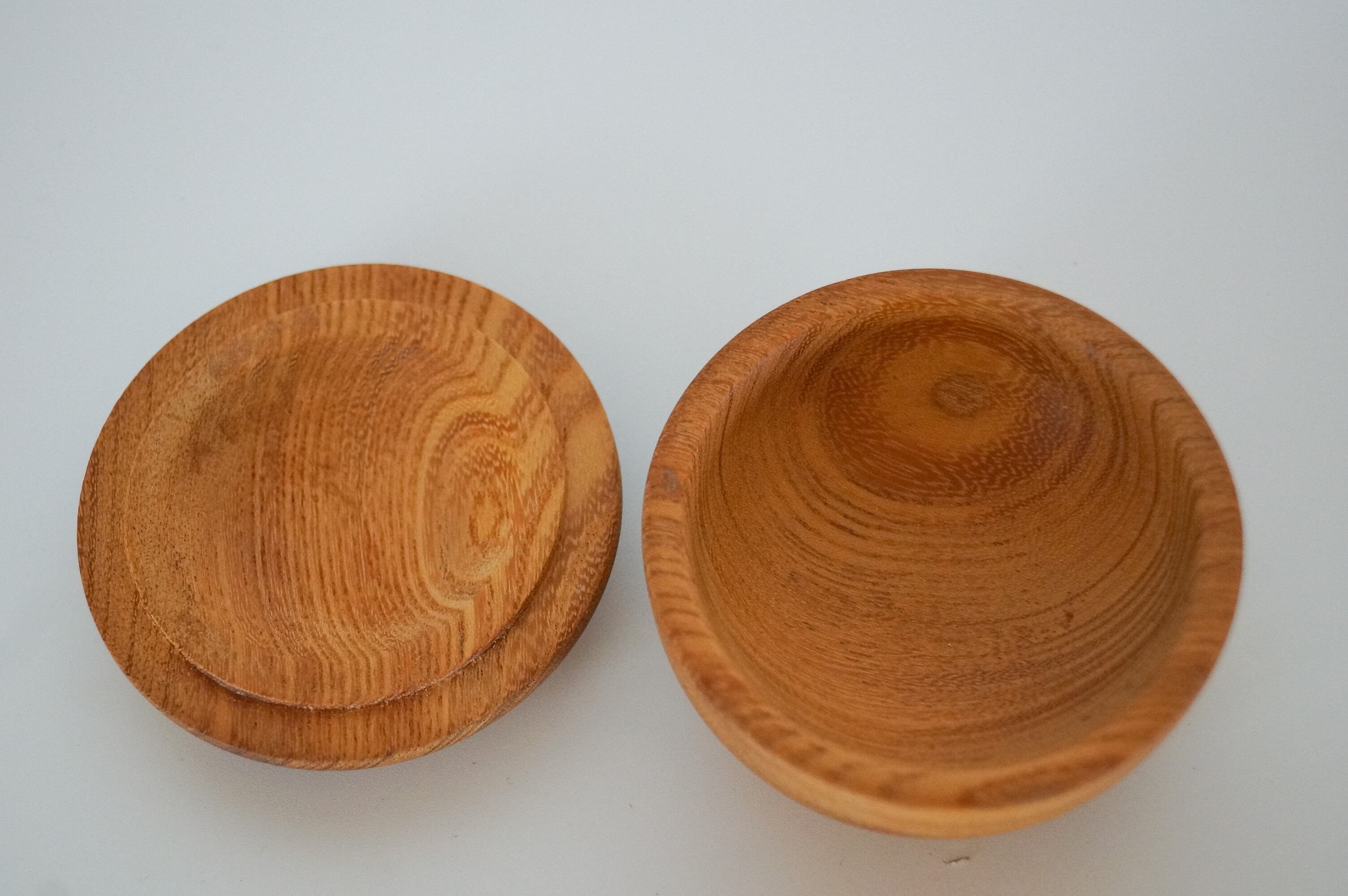 ケヤキ材 オイル塗装 size 径73mm✖️高さ45mm(蓋をした状態) 蓋を外した高さ32mm 目のつんだ、上質のケヤキの小箱です。 一つの木から本体、蓋を作っているので木目がつながります。 指輪、ピアスなどアクセサリー入れに可愛らしい形となってます。 お手入れは乾拭きしてください。